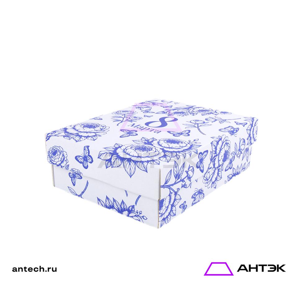 Подарочная коробка к 8 марта крышка-дно 270х215х90 МГК с печатью "Синие пионы"