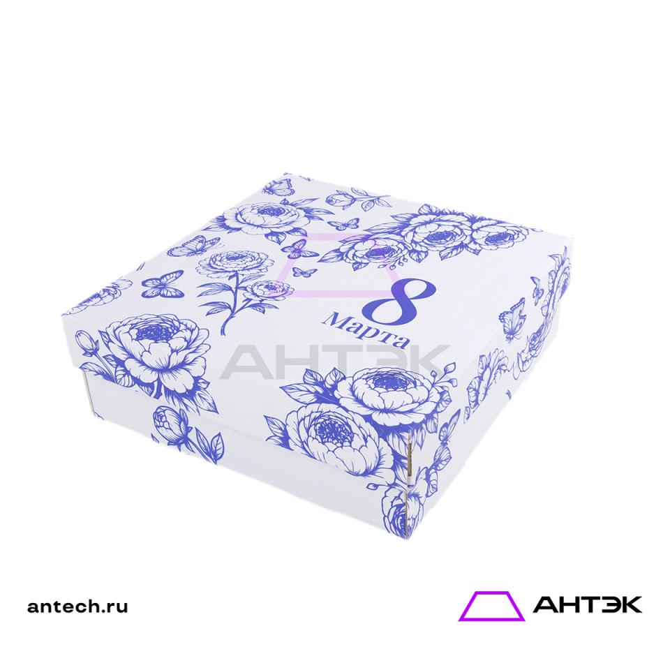 Подарочная коробка к 8 марта крышка-дно 300х300х100 МГК с печатью "Синие пионы"