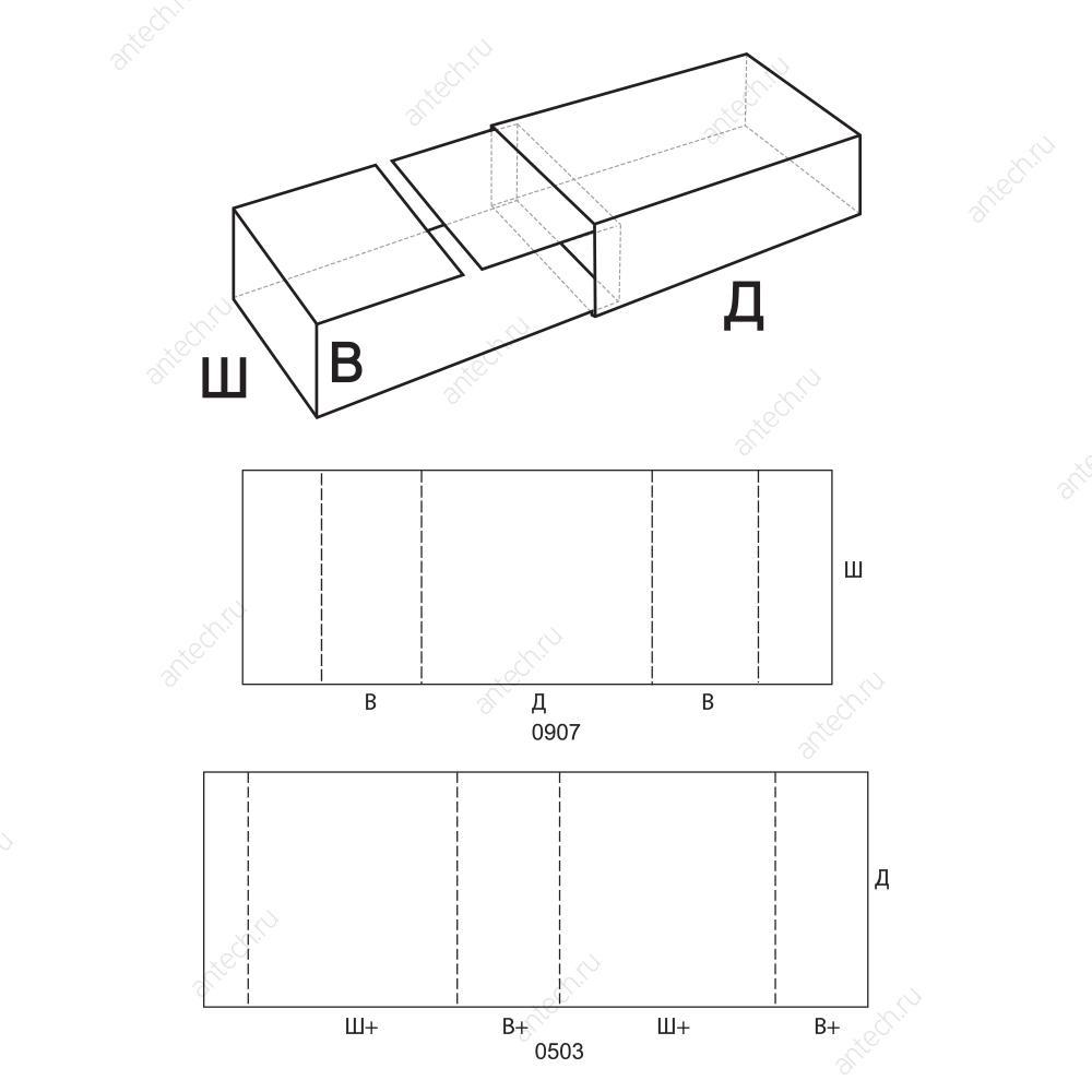 Коробка пенального типа представлена обечайкой со склейкой и прокладкой с биговками. Модель отличается простой конструкцией, которая легко собирается из двух гофрокартонных заготовок. Из одного листа склеивается прямоугольная рама. Другой элемент загибается четыре раза для формирования особой вставки, которая интегрируется в единую конструкцию. Модификация востребована для складирования и реализации товаров массового потребления небольших размеров.
