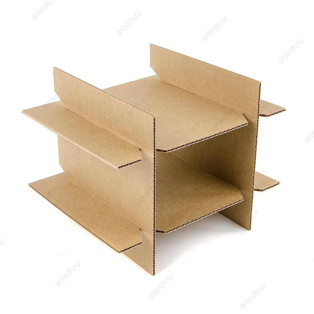 Решетка вертикального типа с усиленными углами собрана из четырех гофрокартонных элементов. На заготовках сделано по две прорези на одинаковом расстоянии друг от друга. Кроме того, ближе к краям каждый из листов имеет два сгиба. В собранном состоянии конструкция представлена вместительной центральной ячейкой квадратной формой и семью ячейками поменьше. Изделие вставляется в коробку для упаковки и транспортировки сборной продукции, которая поставляется в едином наборе.