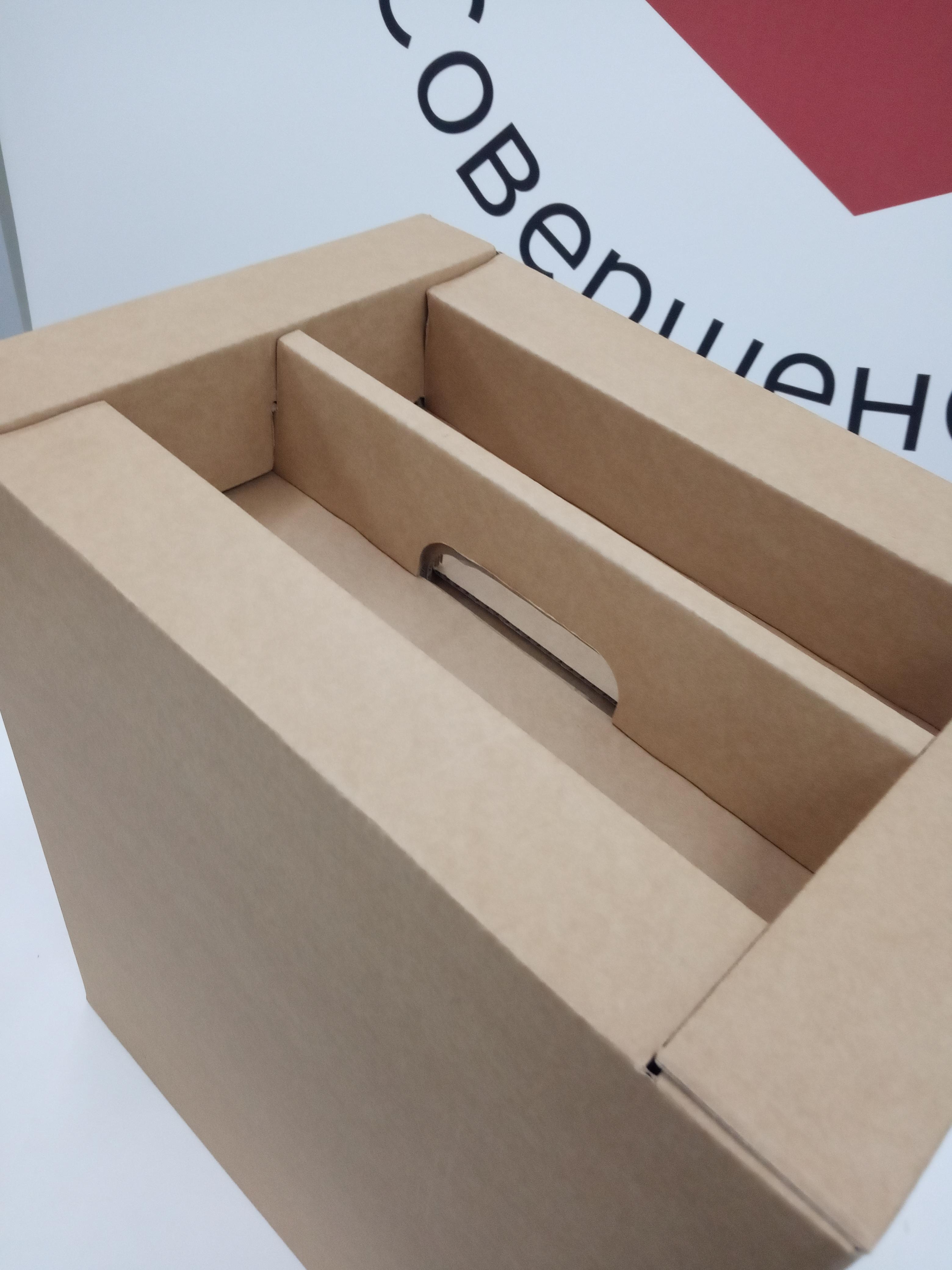 Для решения этой задачи мы использовали бурый трехслойный гофрокартон, из которого изготовили двухсоставную транспортно-маркетинговую упаковку, состоящую из четырехклапанной коробки с дном типа «ласточкин хвост» и специальной вставки.