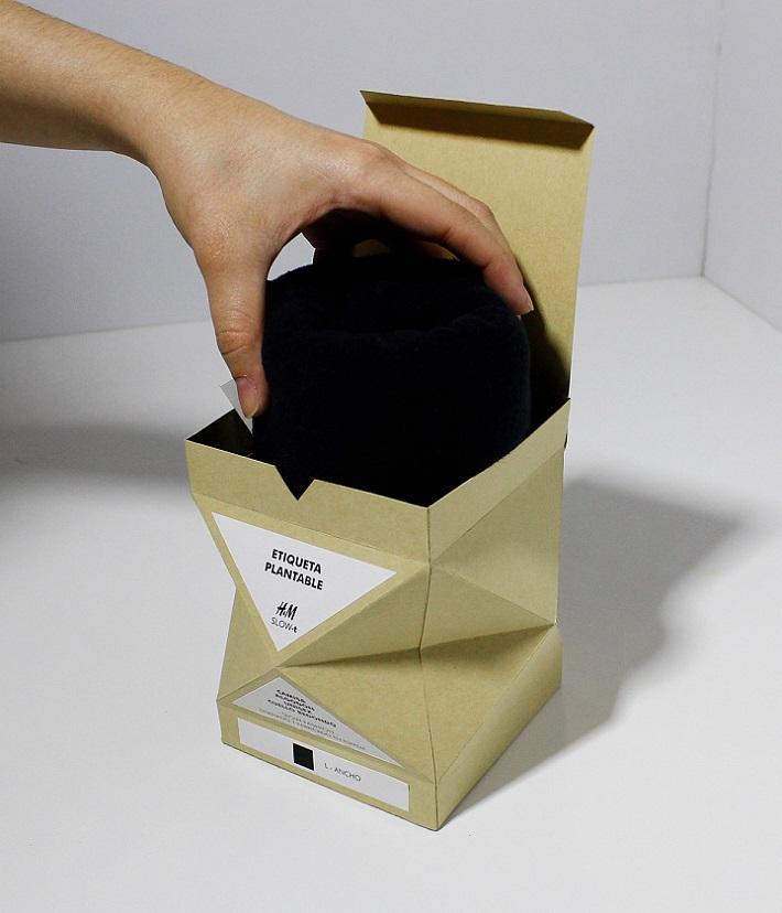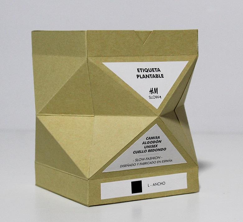 Испанский дизайнер Lucia Cobos разработала конструкцию коробки для упаковки одежды H&M Slow-t, которая после применения по прямому назначению может быть использована как горшок для комнатных растений, семена которых прилагаются, они находятся прямо в бирке одежды, на ней же напечатана инструкция по их выращиванию.