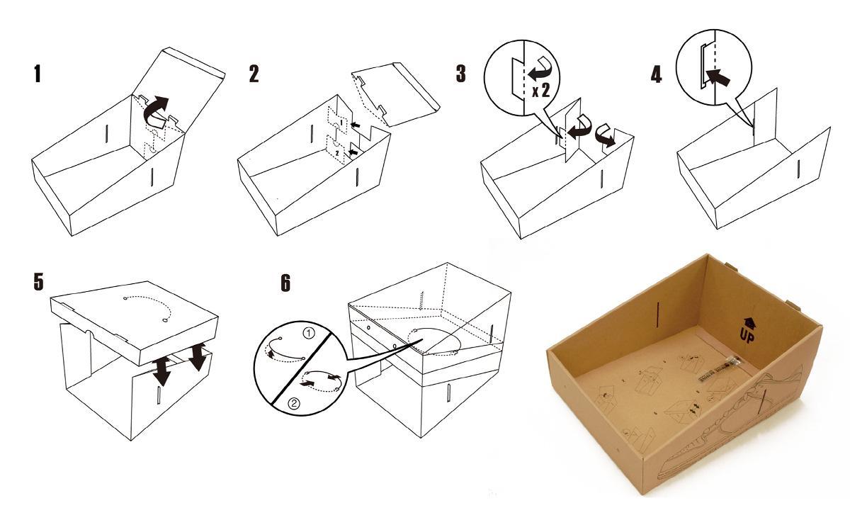 Оформлена она одноцветной печатью с внешней и внутренней стороны: изображения обуви и инструкция по сборке из нее тумбочки.