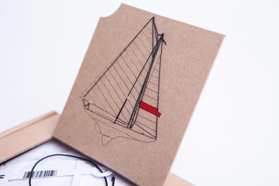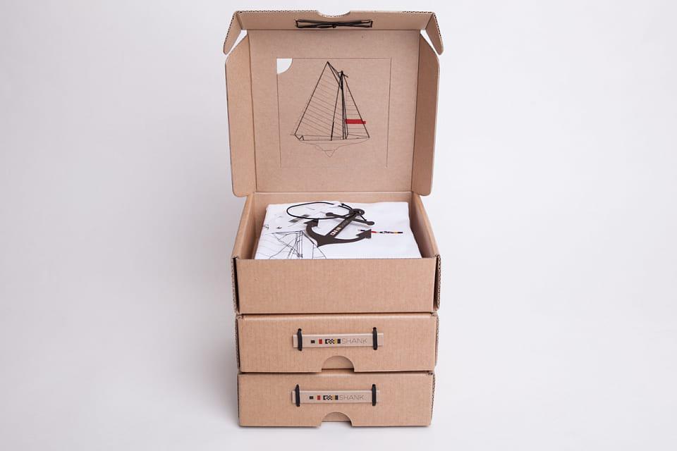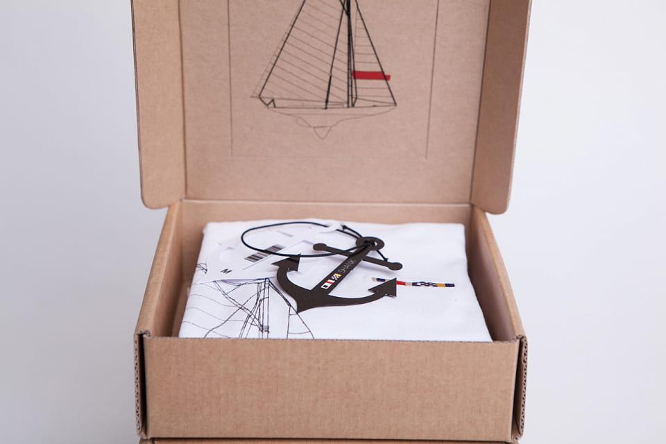 Дизайн упаковки отличается уникальной конструкцией и дизайном. Коробки изготовлены из гофрокартона, в крышке каждой проделано открывающееся окошко, на котором напечатана лодка, та же что и на упакованной футболке, причем такелаж вышит черными нитками. Ручки у коробок также оригинальные, это деревянные пластинки с логотипом и названием бренда.