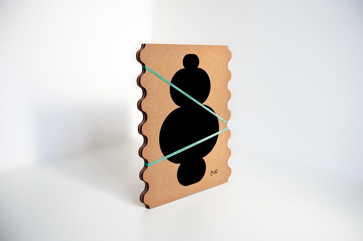 Zup Design создали упаковку из гофрокартона для 3-х плакатов Multiverso (в сложенном виде). Упаковка состоит из четырех листов гофрокартона, два внешних, играющих роль задней и передней стенки (на них нанесена печать в один цвет: логотип и сопутствующая информация) и два внутренних с прорезанным окном для вложения в него постеров. Упаковка закрывается двумя промышленными резинками.