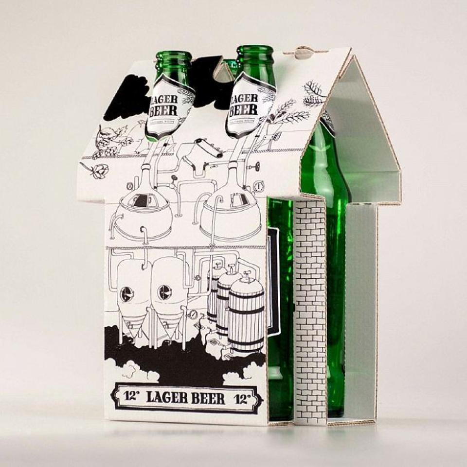 Оригинальная конструкция упаковки напоминает формой дом, а дизайн оформления обыгрывает тему пивоварни, причем трубы пивных котлов символически выходят в бутылочные горлышки.